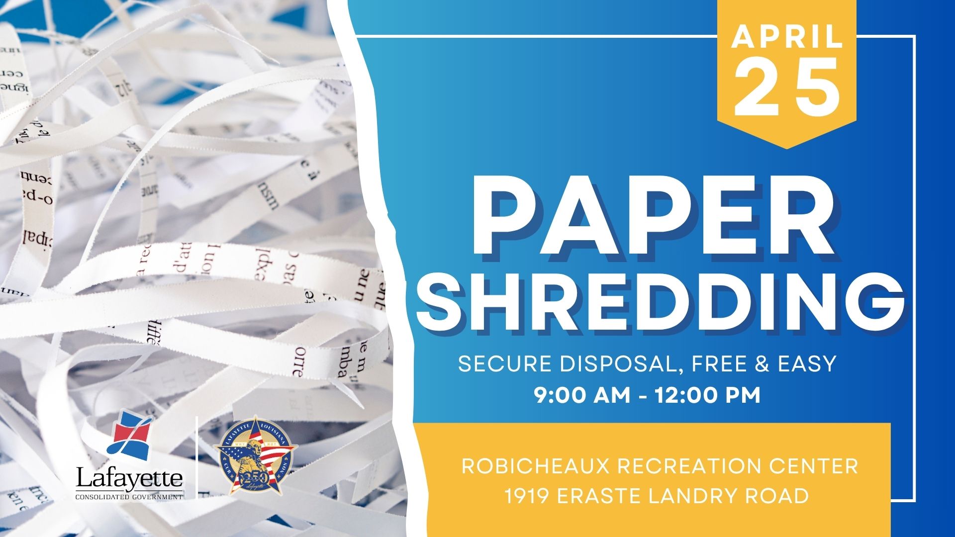 Lafayette Consolidated Government and Keep Lafayette Beautiful invite residents to participate in the annual Paper Shredding Day, a free and secure way to dispose of sensitive documents. The event will take place on Saturday, April 25, 2026, from 9:00 a.m. to 12:00 p.m. at the Robicheaux Recreation Center. This initiative helps protect personal information, reducing the risk of identity theft while promoting environmental responsibility. All documents are shredded on-site and properly recycled. Event Details: