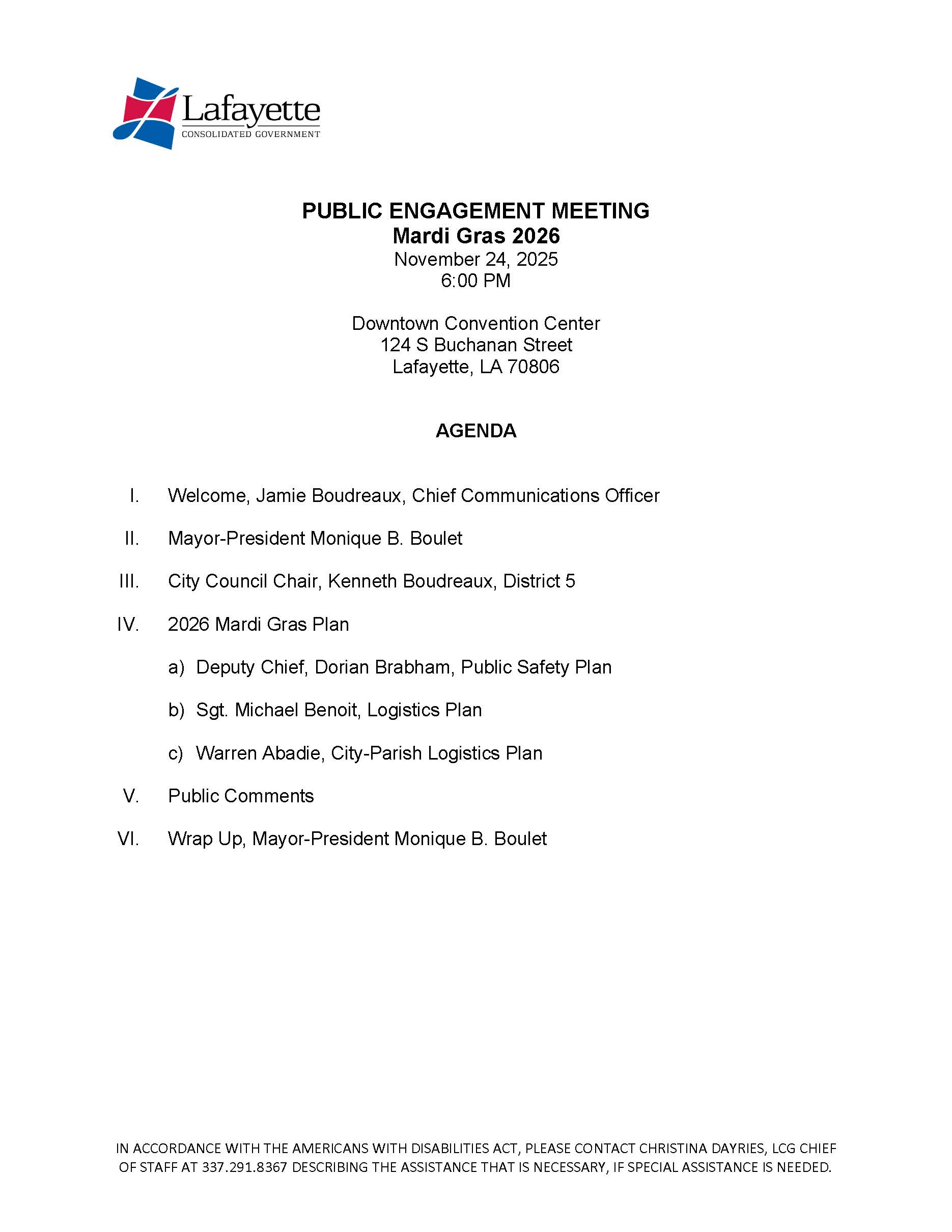 You’re Invited to our Mardi Gras Public Meeting 🎭 Lafayette Consolidated Government and the Lafayette Police Department invites residents, krewe members, business owners, and parade-goers to a public meeting. 📅 Monday, November 24 Your input helps shape a safe, fun, and successful Mardi Gras season for our community. We hope to see you there!