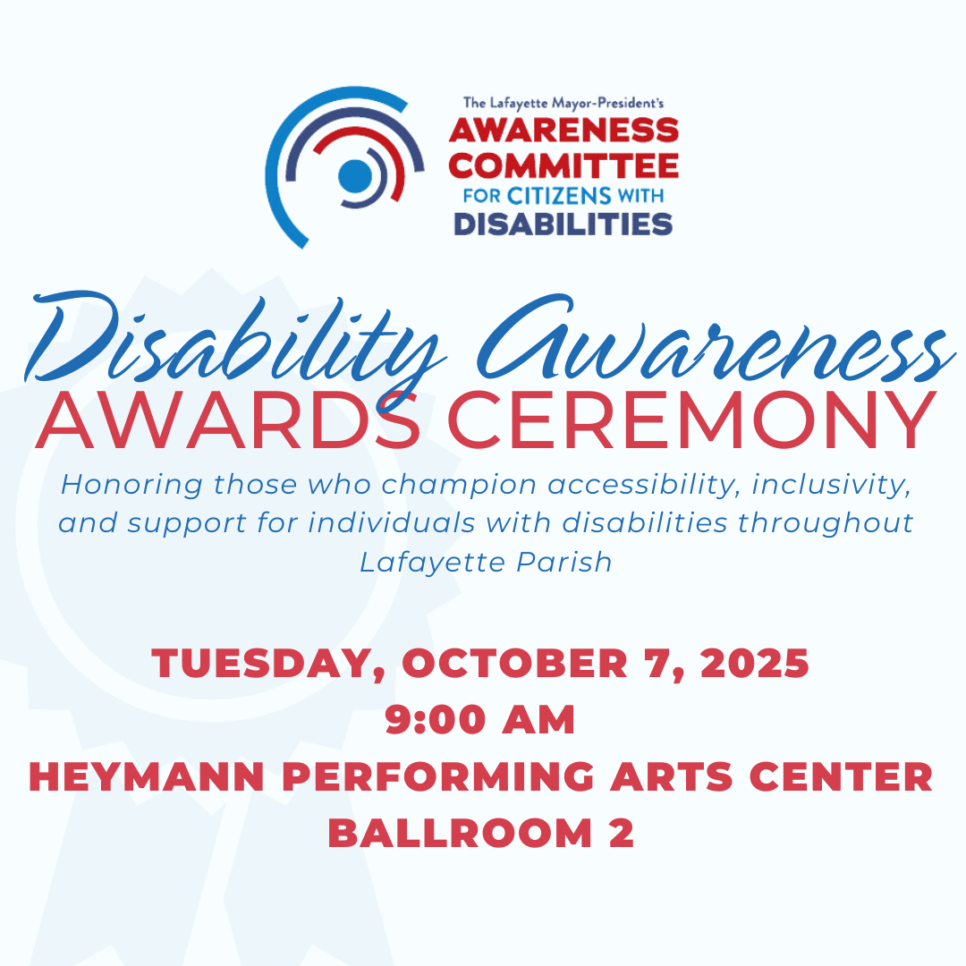 Honoring those who champion accessibility, inclusivity, and support for individuals with disabilities throughout Lafayette Parish. The event is free and open to the public.