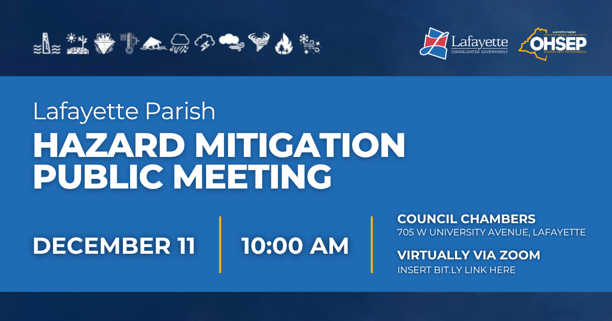 📢 Public Meeting: 2026 Hazard Mitigation Plan Update Lafayette Consolidated Government and the Lafayette Parish Office of Homeland Security and Emergency Preparedness (OHSEP) are hosting a public meeting to gather community input for the 2026 Hazard Mitigation Plan. Residents, business owners, and stakeholders are encouraged to attend and share feedback on flooding, drainage, severe weather, and other natural hazards that impact our parish. Your input plays a vital role in shaping strategies that strengthen emergency preparedness and build long-term community resilience. Public Participation Options Members of the public may attend this meeting in person or join virtually via Zoom: