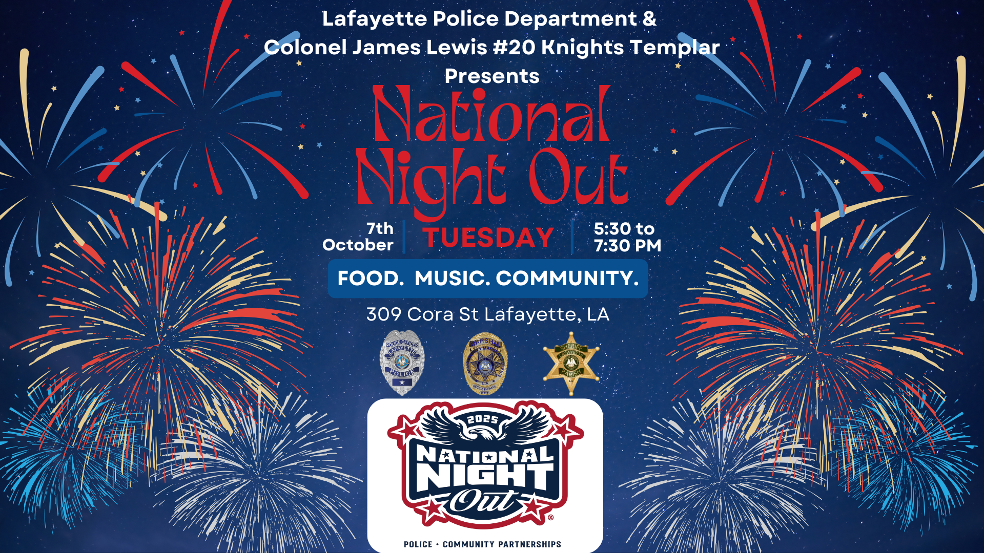 Neighborhoods throughout Lafayette are being invited to join forces with thousands of communities nationwide for the “42nd Annual National Night Out” (NNO) crime and drug prevention event. From 5:30 pm to 7:30 pm on October 7th, residents in neighborhoods throughout Lafayette are asked to lock their doors, turn on outside lights, and spend the evening outside with neighbors and police at the MLK Center. Kids can enjoy a fun jump, pizza, face painting, meeting McGruff the Crime Dog, and horses of LPD’s Mounted Patrol, and they can walk through the Lafayette Fire Department’s Smoke House, where fog simulates smoke and firefighters teach them how smoke detectors work and how to escape a fire. High school students interested in a career in law enforcement can learn about and sign up for the LPD Explorer Program. In addition, nearly a dozen organizations and law enforcement partners will be on hand offering information to those who attend. ![]()