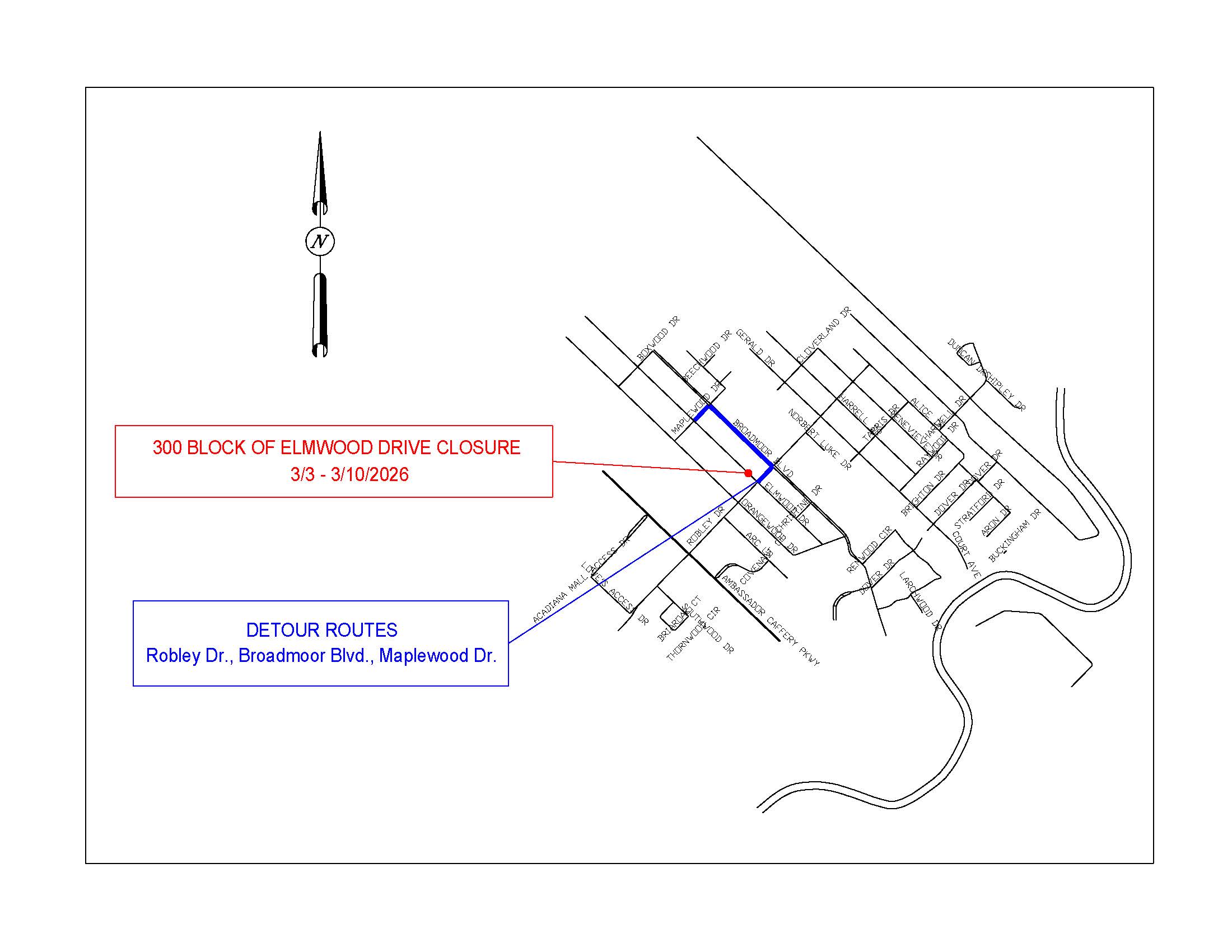 - Detour routes will be posted and include Robley Drive, Broadmoor Boulevard, and Maplewood Drive.