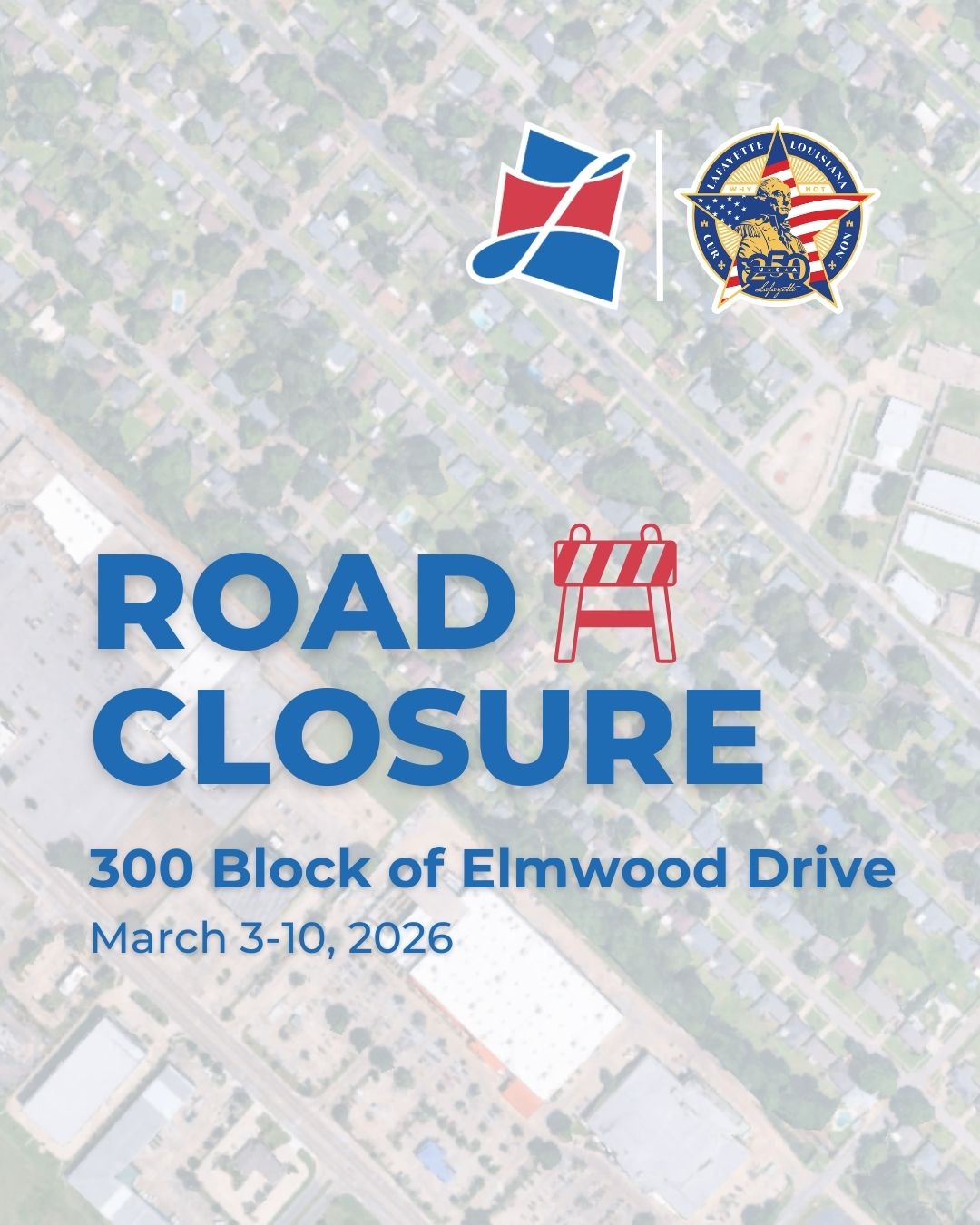 Lafayette, LA – Lafayette Consolidated Government (LCG) will close the 300 block of Elmwood Drive, between Robley Drive and Maplewood Drive, for daily work from Tuesday, March 3 through Tuesday, March 10, 2026.