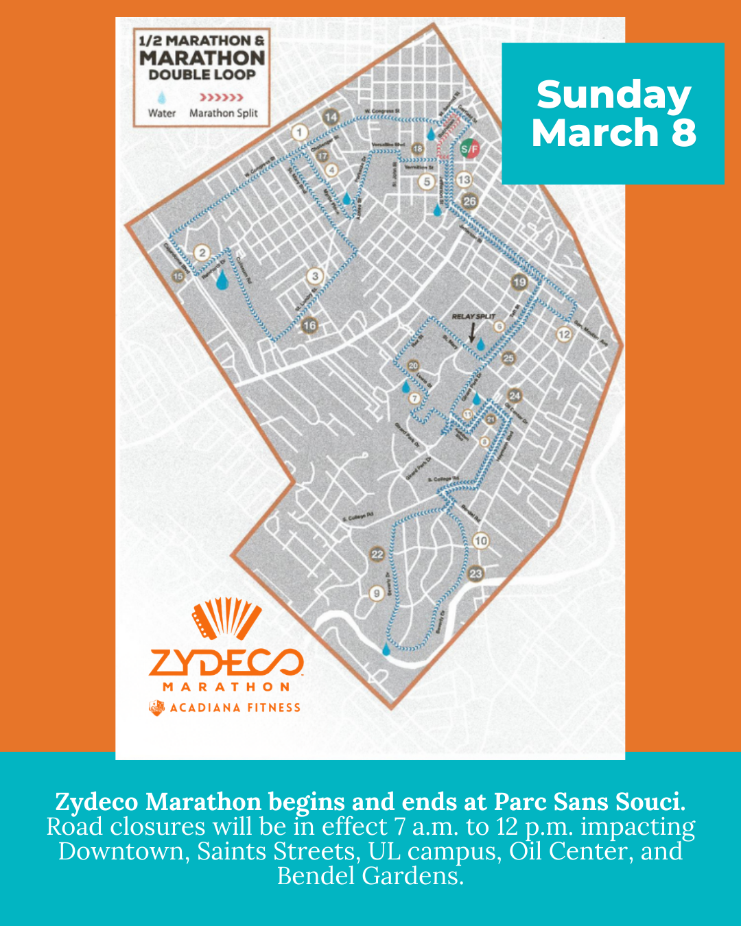 ZYDECO MARATHON RETURNS SUNDAY; ROAD CLOSURES PLANNED ACROSS LAFAYETTE