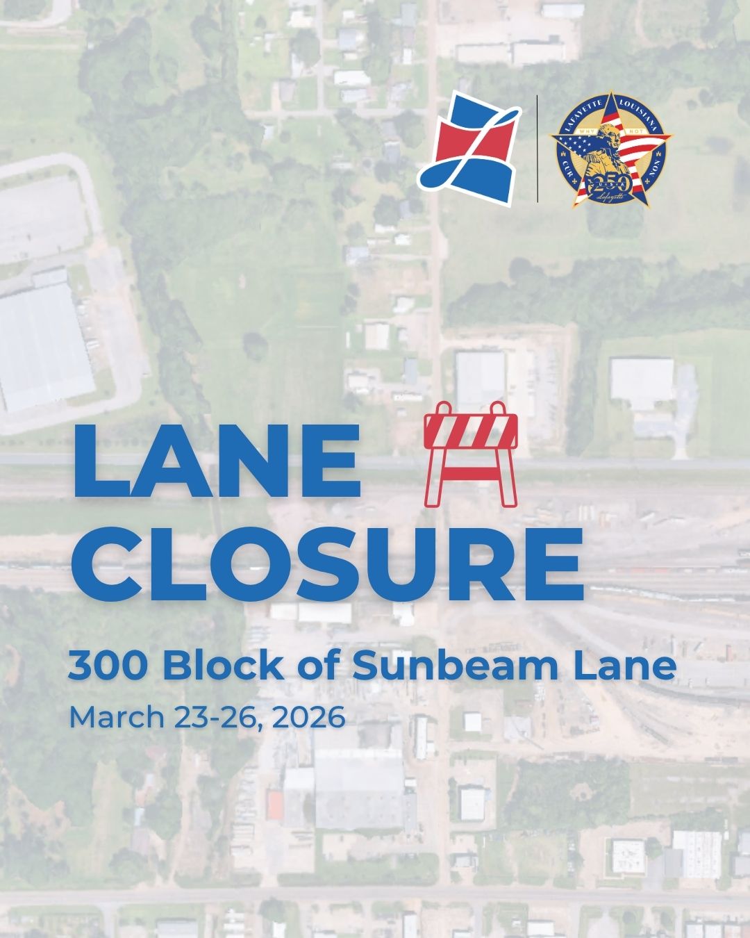 Lafayette, LA – The 300 block of Sunbeam Lane at its intersection with Walker Road will be closed to vehicular traffic now through Thursday, March 26, 2026.