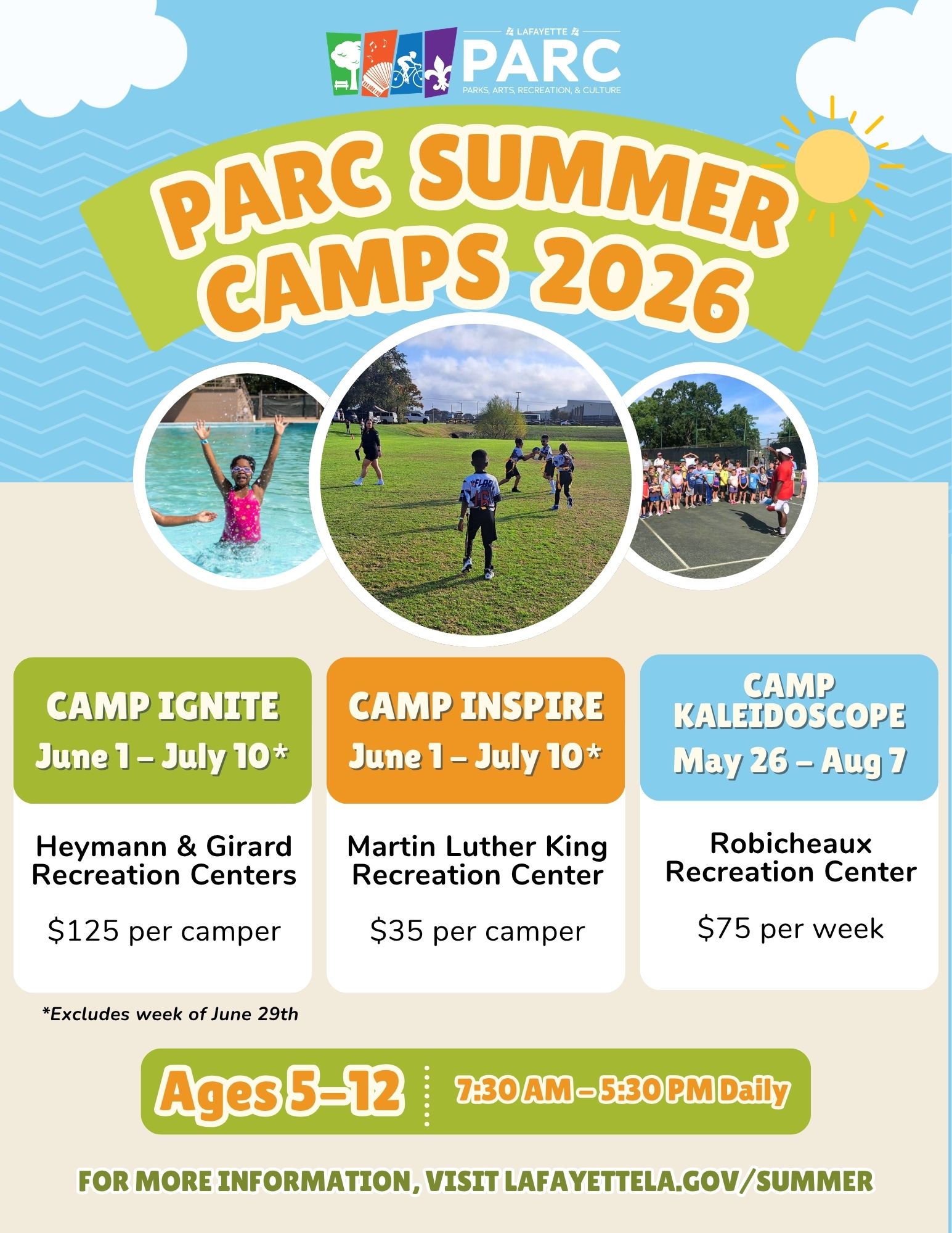 For more information, visit lafayettela.gov/summer or contact the PARC office by calling 337-291-8370 or emailing parc@lafayettela.gov.