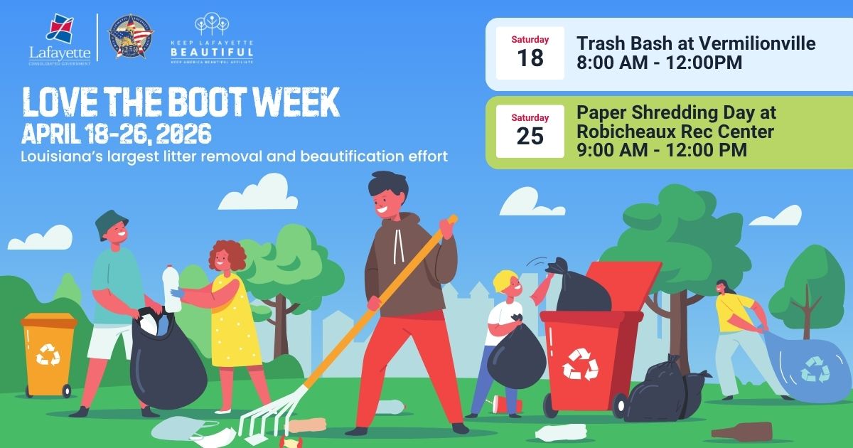 Lafayette, LA – Lafayette residents have two easy ways to take action during Love the Boot Week, April 18-26, as Lafayette Consolidated Government (LCG) announces Trash Bash and Paper Shredding Day—two community events focused on keeping Lafayette clean, safe, and sustainable.