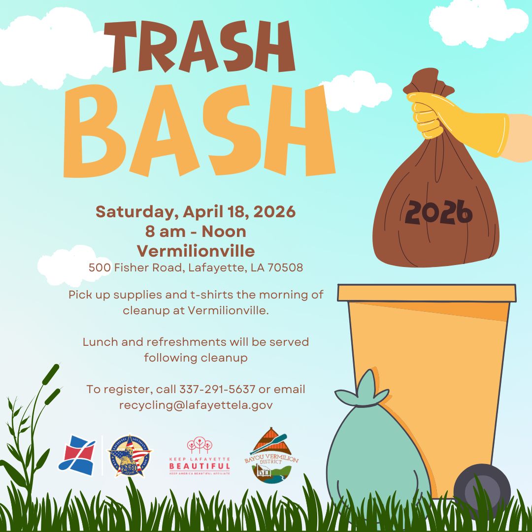 Join Keep Lafayette Beautiful and LCG’s Environmental Quality Division, in partnership with Bayou Vermilion District. Let’s work together to clean up Lafayette’s streets, parks, and waterways! After the cleanup, volunteers will be treated to lunch as a thank-you for making a difference. How to Participate: What to bring: A durable water bottle, closed-toe shoes, and sunscreen.