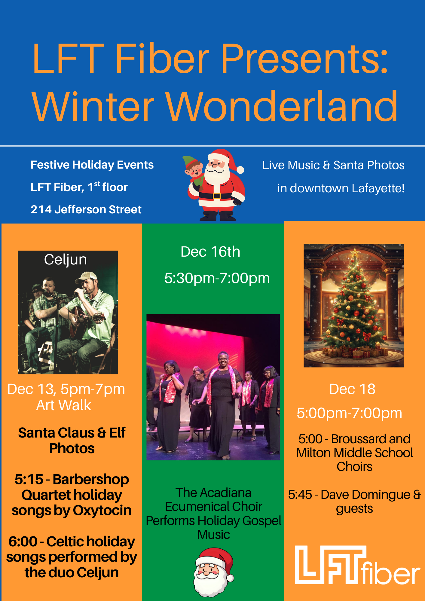 Festive holiday events at LFT Fiber throughout the month of December! Listen to live music and take photos with Santa in Downtown Lafayette.