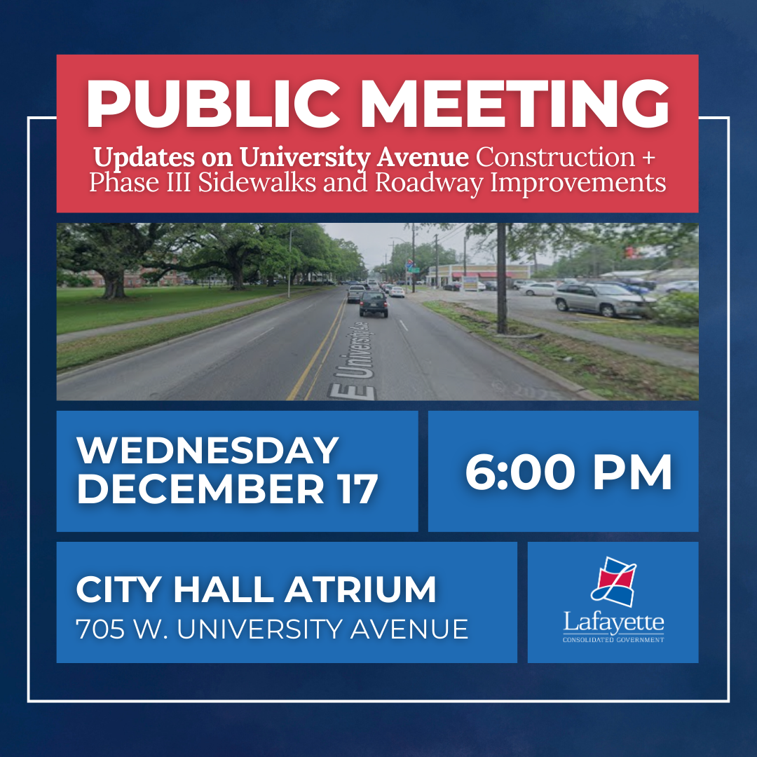 Lafayette Consolidated Government invites you to a Public Meeting for University Avenue Phase III to share project updates and gather community input. Attendees will be able to view conceptual designs, ask questions about construction timelines, and learn about next step. We hope you’ll join us to help shape the next chapter of University Avenue. December 17, 2025 at 6:00 p.m. City Hall Atrium (705 W. University Ave.)