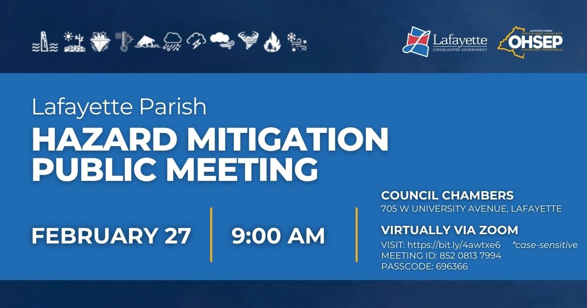 📢 Public Meeting: 2026 Hazard Mitigation Plan Update Lafayette Consolidated Government and the Lafayette Parish Office of Homeland Security and Emergency Preparedness (OHSEP) are hosting a public meeting to gather community input for the 2026 Hazard Mitigation Plan updates. Residents, business owners, and stakeholders are encouraged to attend and share feedback on flooding, drainage, severe weather, and other natural hazards that impact our parish. Your input plays a vital role in shaping strategies that strengthen emergency preparedness and build long-term community resilience. Public Participation Options Members of the public may attend this meeting in person or join virtually via Zoom: