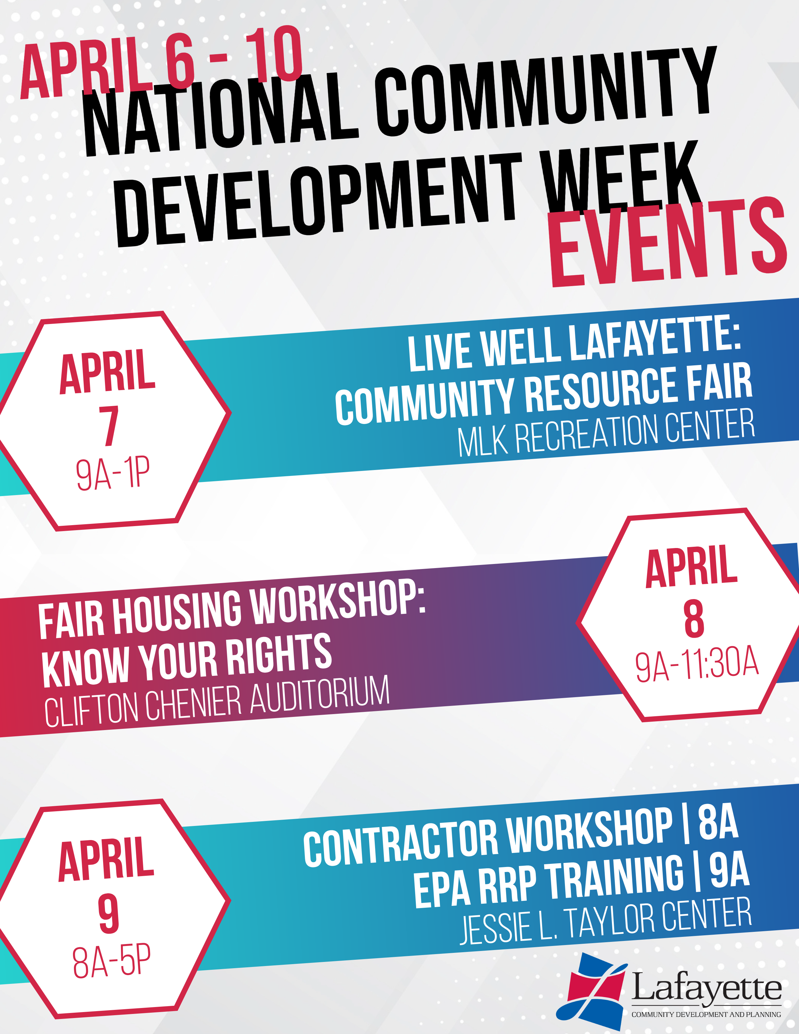 - Fair Housing Workshop with Ross Shales | Wednesday, April 8, 2026 | 9AM-11:30AM | Clifton Chenier Center Auditorium (220 W. Willow St.)