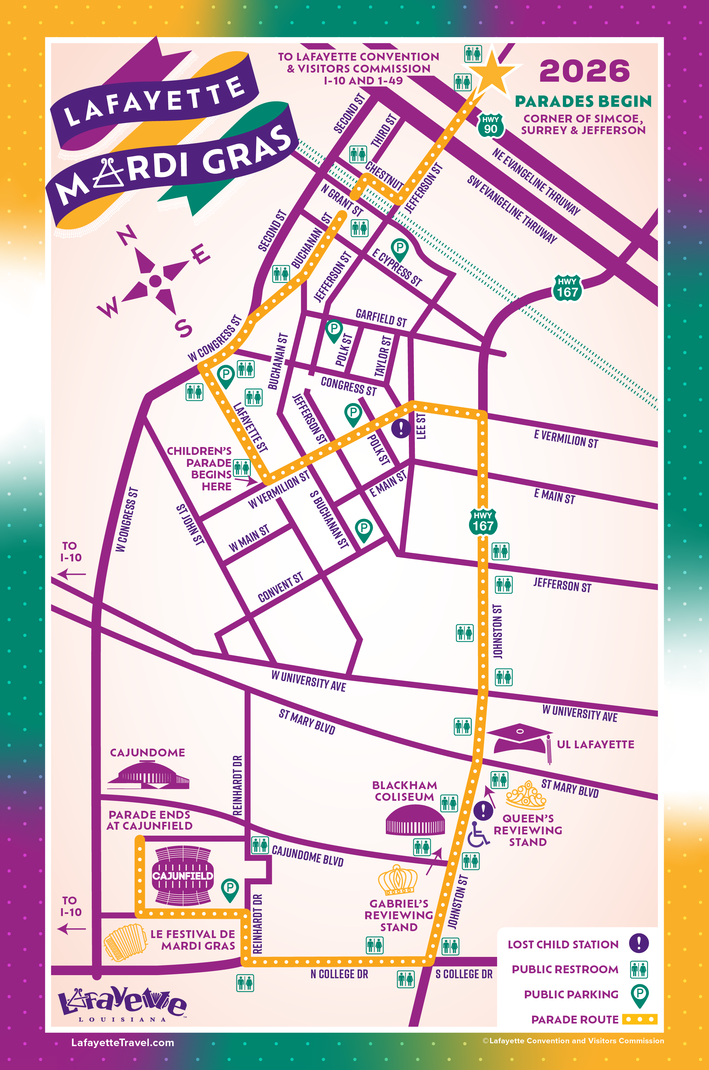Official parade routes, schedules, parking maps, barricade locations, and safety information are available at lafayettela.gov/mardigras. LCG wishes everyone a safe and happy Mardi Gras!