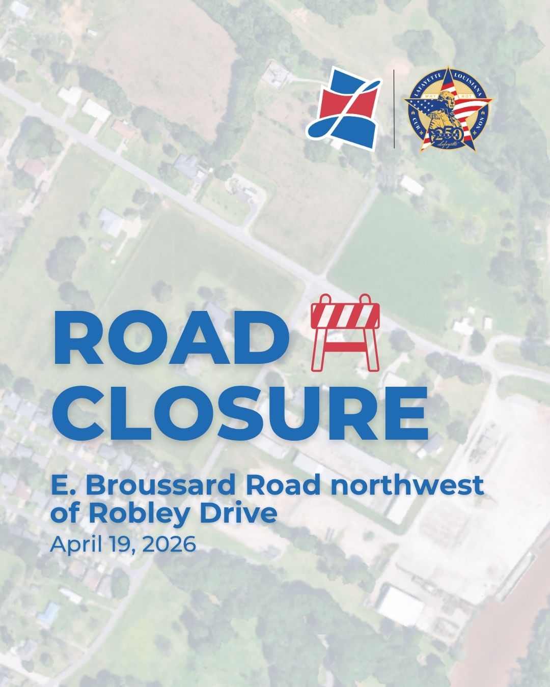 LAFAYETTE, LA – The road closure on E. Broussard Road northwest of Robley Drive has been extended to April 26, 2026 due to weather delays.