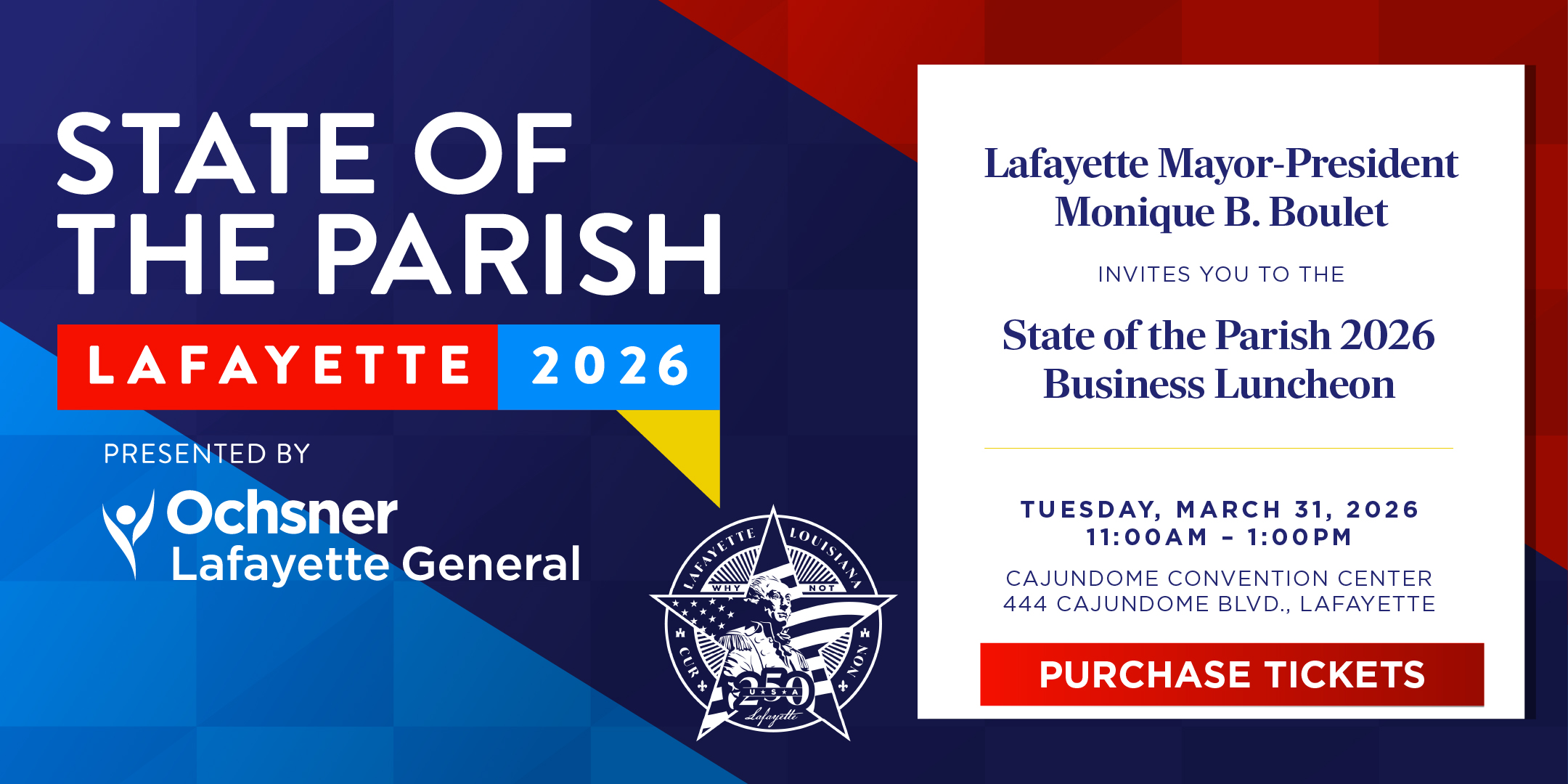 Lafayette Parish stands at a pivotal moment—honoring the milestones that have shaped the past 50 years while looking ahead to what comes next. At the 2026 State of the Parish, Mayor-President Monique B. Boulet will reflect on our shared progress and begin a broader conversation about the future of Lafayette Parish and the opportunities ahead for the next generation. This annual address is a chance for our community to come together, take stock of where we are, and look forward with purpose and optimism.